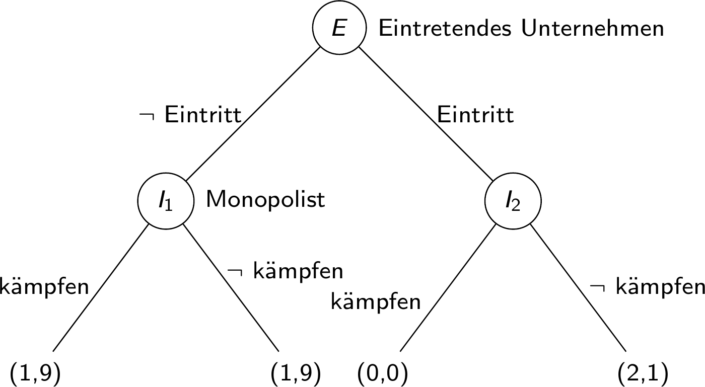 Kommt es zu einem Markteintritt, kann der ehemalige Monopolist entweder “kämpfen” oder nicht (\(\neg\))