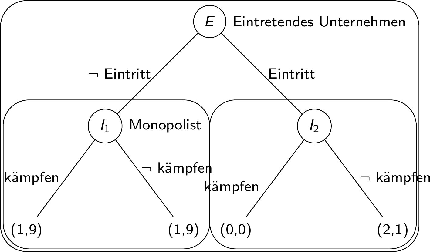 Im ersten dieser Spiele ist der Monopolist indifferent, im zweiten wählt er \(\neg\) kämpfen, und im Gesamtspiel gibt es zwei Nash-Gleichgewichte (siehe oben)