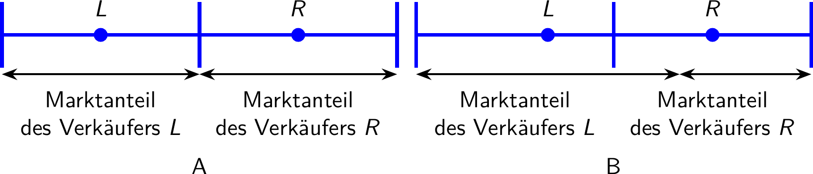 L hat eine einseitig profitable Abweichung: Etwas weiter rechts kann L ein paar Kunden von R anlocken, verliert aber niemanden auf der linken Seite (Gleiches gilt für R)