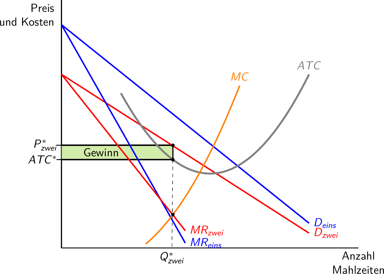 Nehmen wir nun an, dass die Eisverkäufer ihre Preise selbst setzen können, keine Grenzkosten haben und Konsument:innen immer ihren Nutzen minus Wegkosten und Preis maximieren