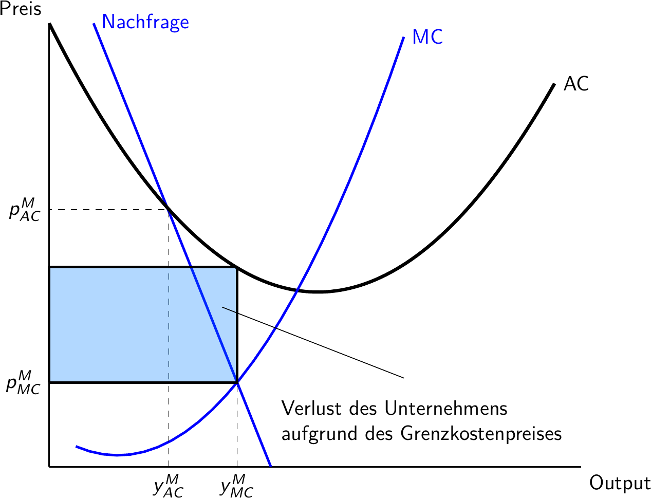 Problem: Der Preis muss beim natürlichen Monopol unterhalb der Durchschnittkosten liegen (siehe nächste Folie)